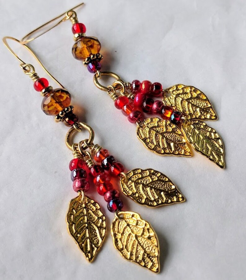 Red Gold Chandelier Earrings Colorful Extra Long Dangle Drop Czech Glass Bead Gold Leaf Charm Bohemian Boho Gypsie Style Earrings Jewelry