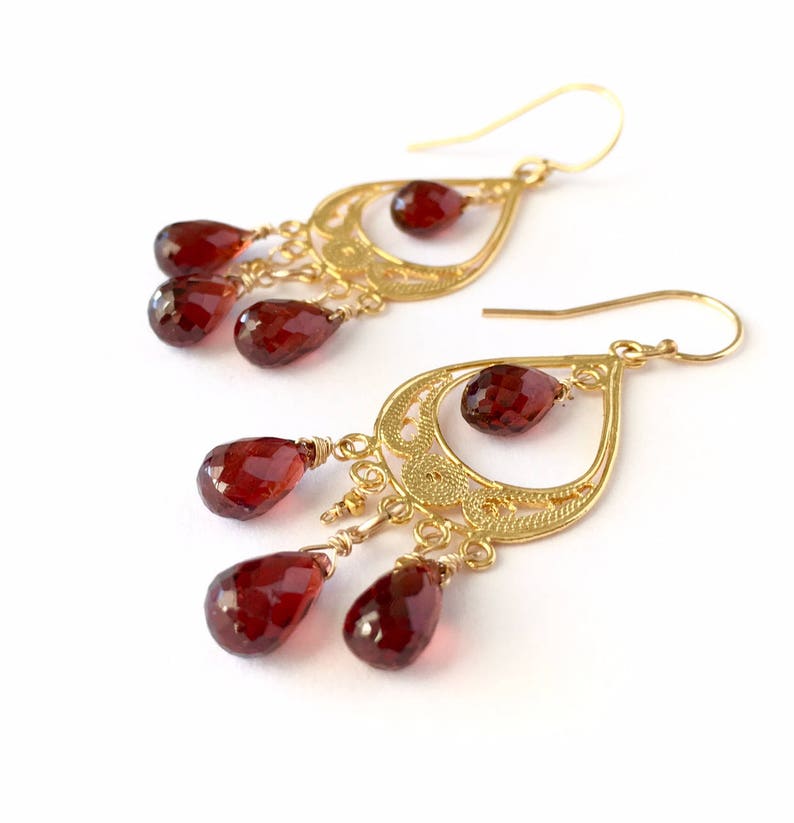 Red Garnet Gold Vermeil Filigree Chandelier Earrings Ooak Gold Dark Burgundy Natural Garnet Chandelier Earrings Valentines Day