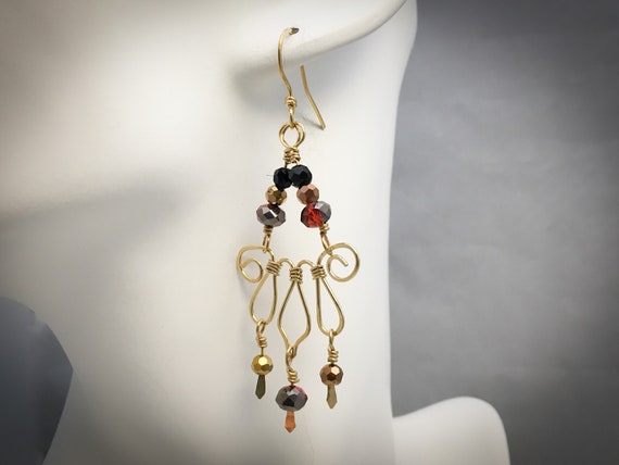 Brass Forged Wire Chandelier Earrings With Red Gray Gold And Black Crystals Mx 16003 008