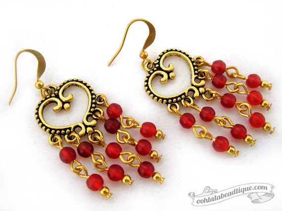 Red Chandelier Earrings Red Glass Earrings Bohemian Dangles Gypsy Earrings Hippie Jewelry Earrings Gold Chandelier Earrings Gift For Her