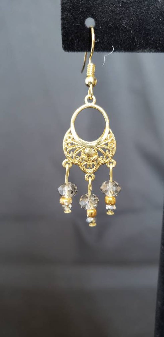 Small Chandelier Earrings With Smokey Clear Glass Beads India Inspired Gold Filigree Looks Like A Purse Great For Dress Or Casual Wear