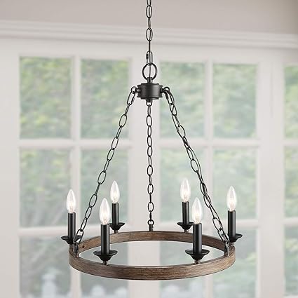 Laluz 6 Light Farmhouse Wagon Wheel Chandelier For Living Room Faux Wood Kitchen Island Lighting For Dining Room