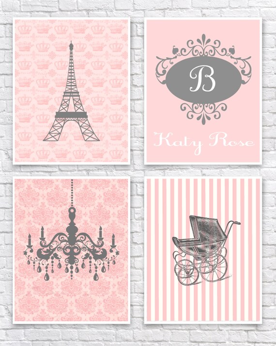 Paris Bedroom Art French Wall Art Paris Nursery Art Paris Wall Decor Pink And Gray Monogram Chandelier Eiffel Tower Carriage