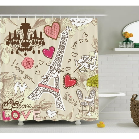 Paris Shower Curtain Doodles Illustration Of Eiffel Tower Hearts Chandelier Flower Love Themed Vintage Fabric Bathroom Set With Hooks Beige Pink