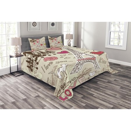 Paris Bedspread Set Doodles Illustration Of Eiffel Tower Hearts Chandelier Flower Love Themed Vintage Decorative Quilted Coverlet Set With Pillow