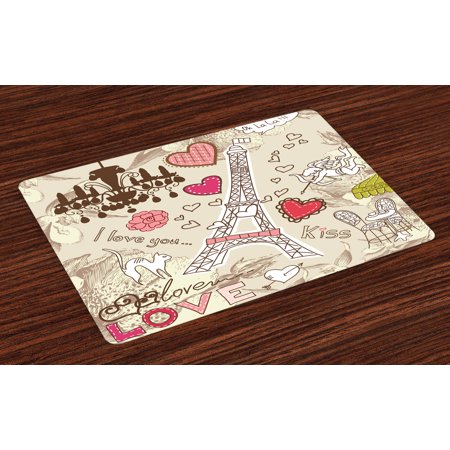 Paris Placemats Set Of 4 Doodles Illustration Of Eiffel Tower Hearts Chandelier Flower Love Themed Vintage Washable Fabric Place Mats For Dining Room