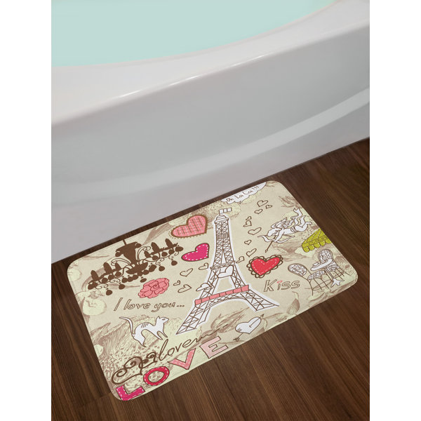 Paris Doodles Illustration Of Eiffel Tower Hearts Chandelier Flower Love Themed Non Slip Plush Bath Rug