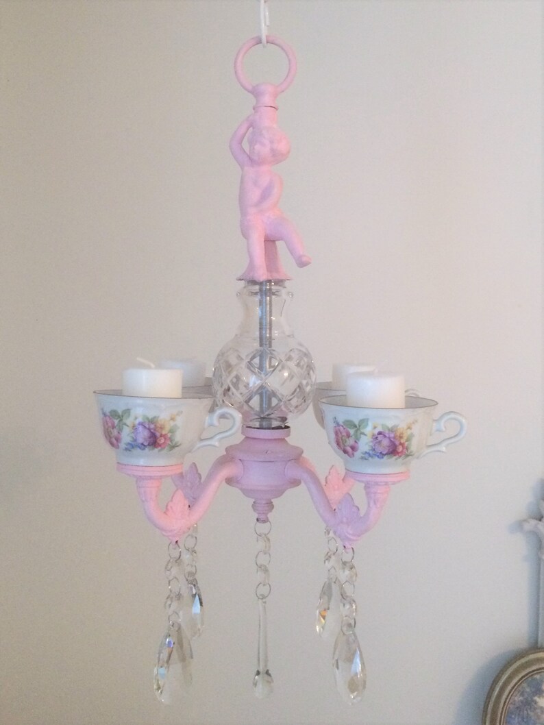 Whimsical Pink Cherub Chandelier With Teacups For Candles Non Electric