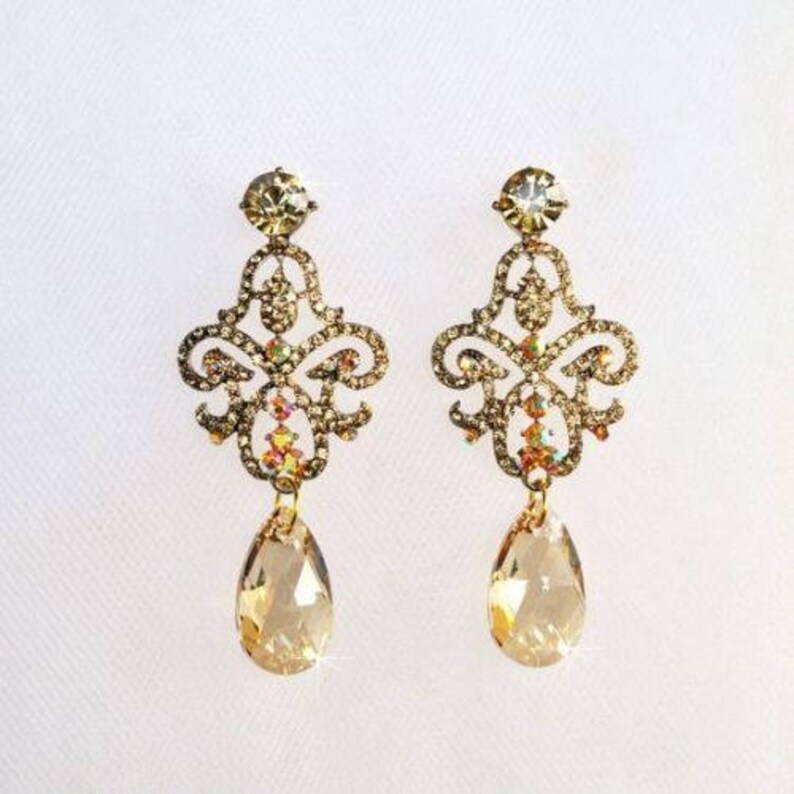 Sale Handmade Gold Crystal Swarovski Golden Shadow Chandelier Crystal Rhinestone Earrings Bridal Wedding Sparkle 2496