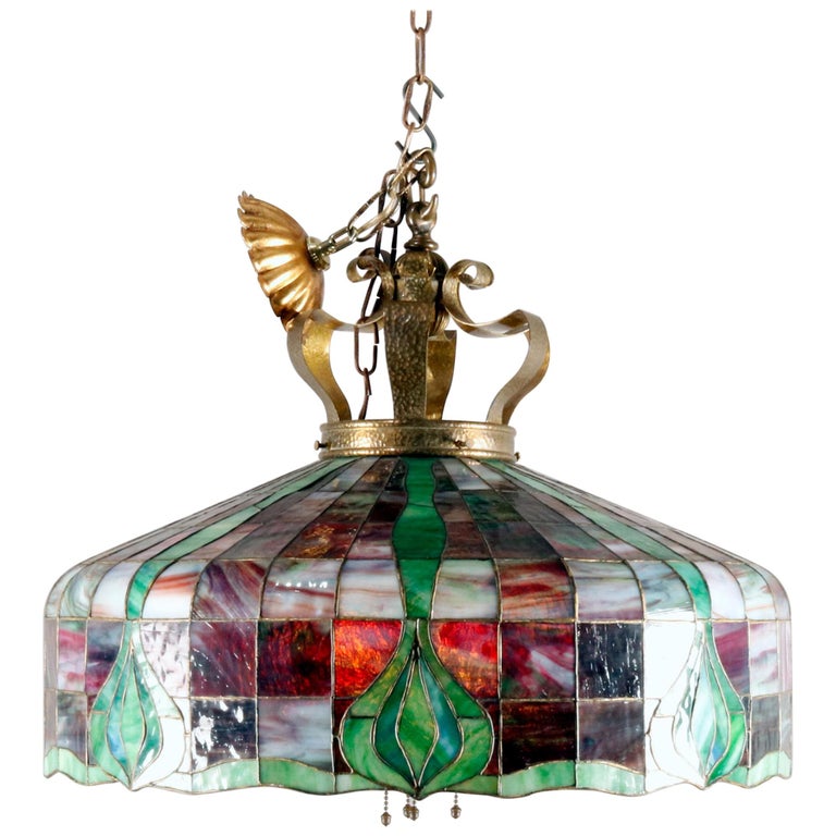 Arts Crafts Leaded Slag Stained Glass Mosaic Dome Chandelier Circa 1910