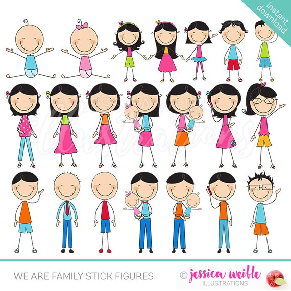 We Are Family Stick Figures Cute Digital Clipart Stick Figure Family Clip Art Stick Figure People Stick Figure Graphics Black Hair