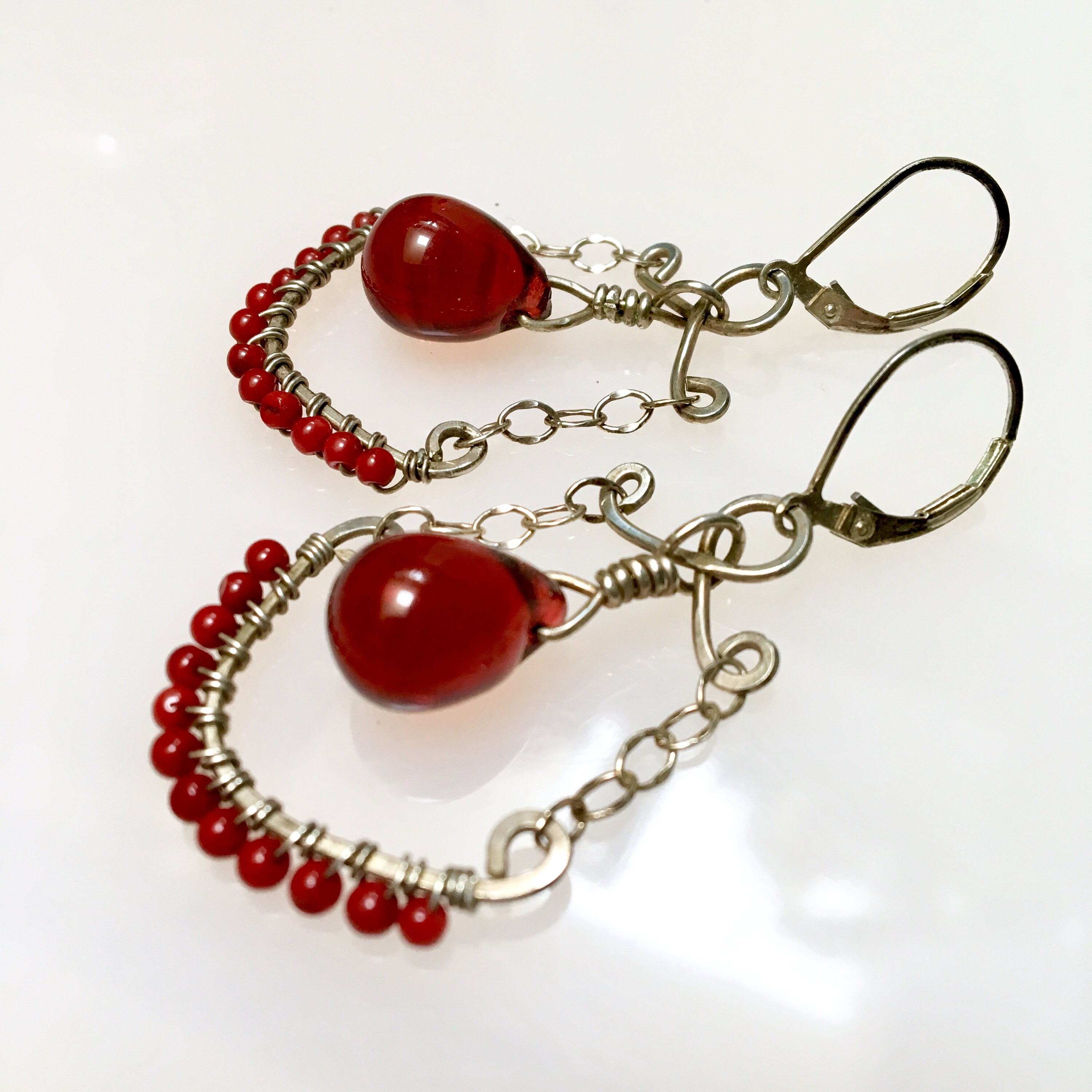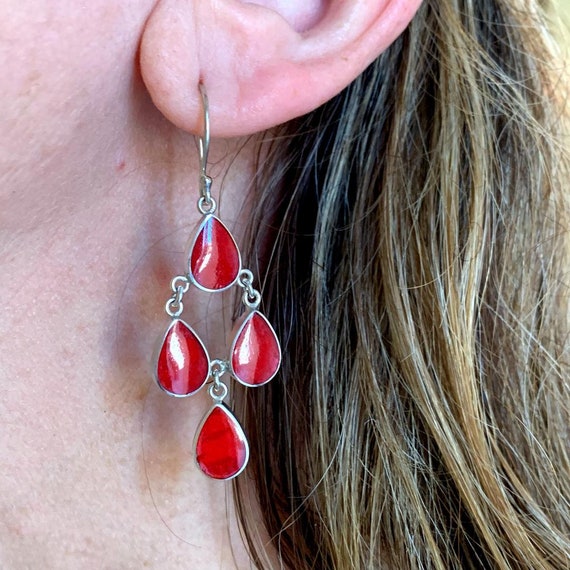 Red Glass Drop Chandelier Earrings With Dark Red Coral