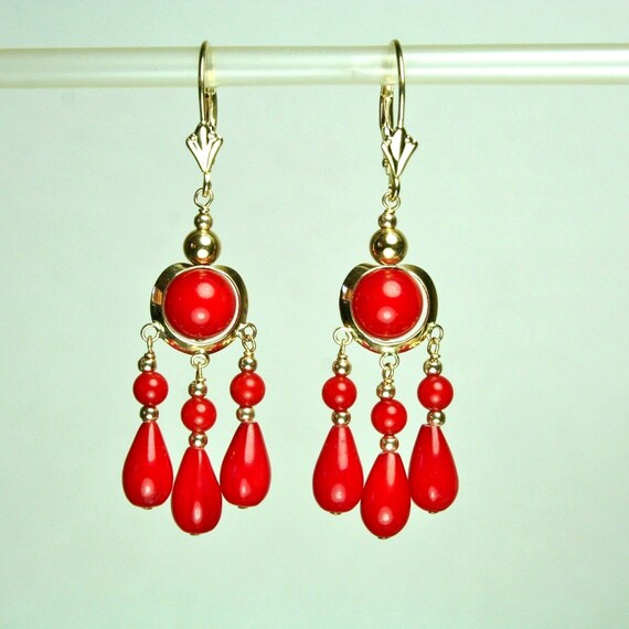 Details About Untreated Mediterranean Red Coral Solid 14kt Gold Chandelier Earrings New
