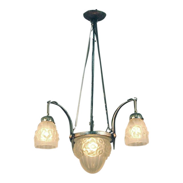 Art Deco French 4 Light Nickeled Wrought Iron Chandelier With Center Bowl