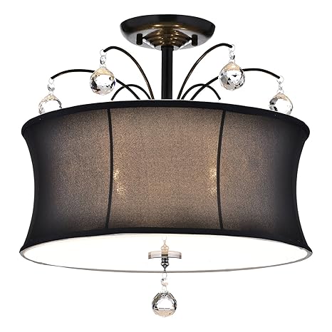 Edvivi 4 Light Black Fabric Drum Shade Semi Flush Mount Chandelier With Crystals Glam Lighting