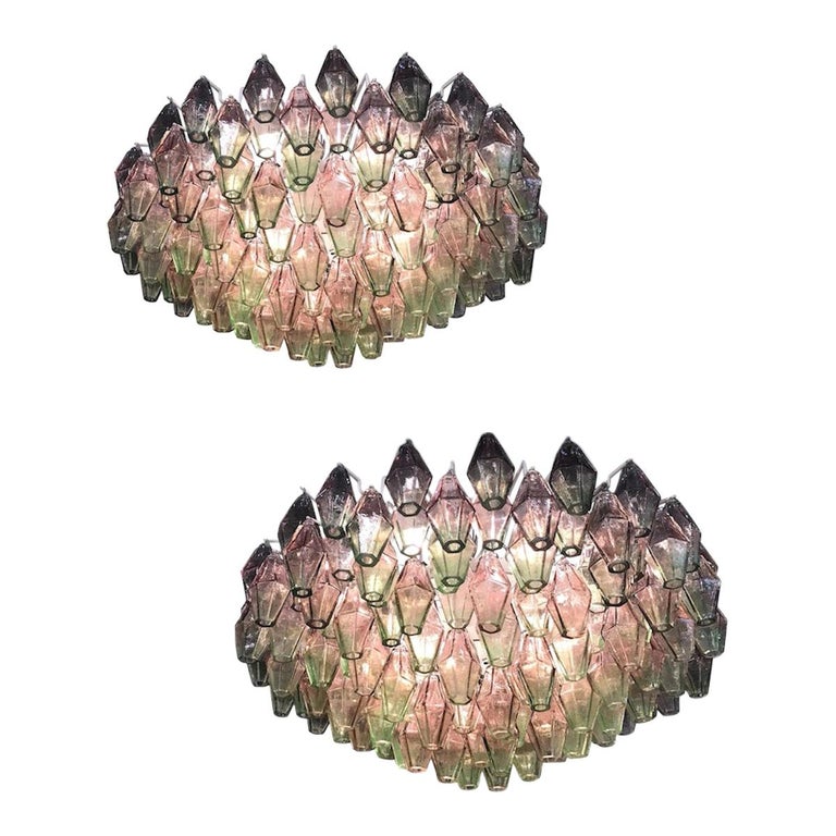 Pair Of Venini Poliedri Carlo Scarpa Pink And Green Murano Glass Chandelier 1955