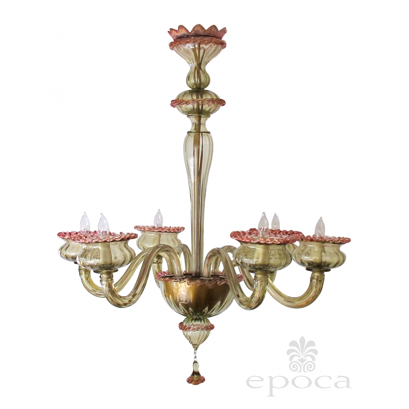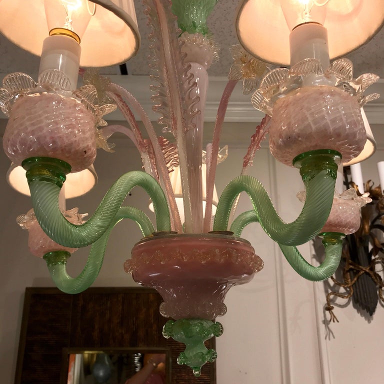 Venetian Pink And Green Murano Glass Five Light Chandelier