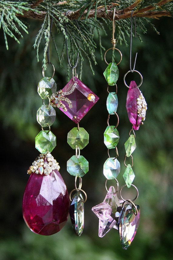 Set Of 4 Jeweled Pink And Green Chandelier Crystal Prisms Encrusted Jewelry Suncatchers Holiday Ornaments Boho Chic Home Decor Original Art