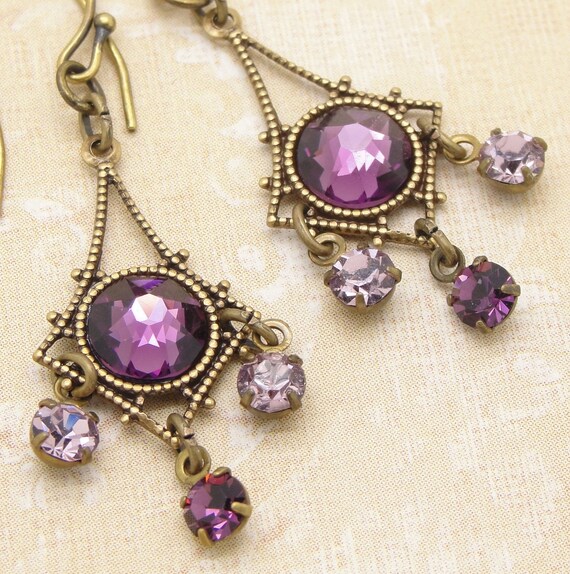 Purple Dangle Earrings In A Small Chandelier Style With Amethyst Swarovski Rhinestones